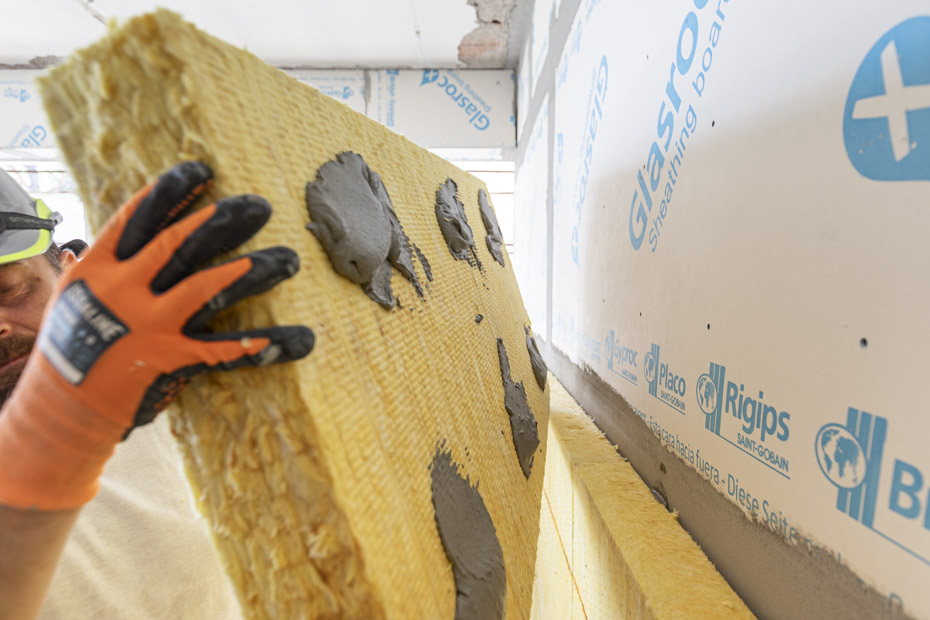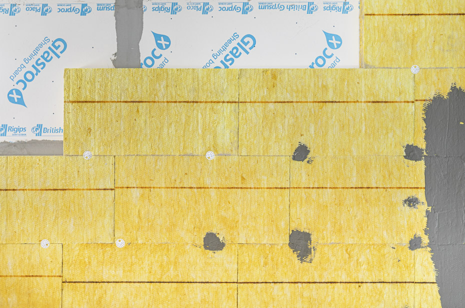 Sistema ad alte prestazioni per i tamponamenti esterni dell’edificio, composto da una parete esterna e da una controparete interna, tra loro distanziate da una lastra Gyproc Habito Forte inserita tra le due strutture metalliche. La controparete interna è formata da una struttura metallica Gyproc Gyprofile – con uno strato isolante in pannelli di lana minerale Isover Arena34 - e da una lastra idrorepellente Gyproc Hydro accoppiata ad una lastra standard Gyproc Wallboard. La parete esterna è invece composta da una struttura metallica Gyproc External Profile Zn-Mg, da uno strato di lana minerale Isover Arena34 e da una lastra ad elevate prestazioni Gyproc Glasroc®X, resistente all’umidità e alla formazione di muffe. Il “pacchetto” parete termina con il pannello isolante in lana di vetro Isover Clima34 G3 ad alta densità, ancorato alle lastre  Gyproc Glasroc®X tramite incollaggio e fissaggio meccanico. La lana di vetro è prodotta con oltre il 95% di materie prime naturali (sabbia, acqua e fino all’80% di vetro riciclato), ed è riciclabile al 100%.