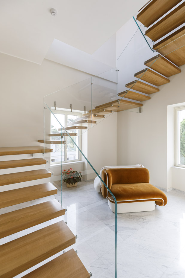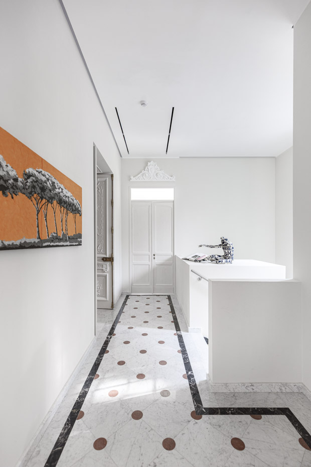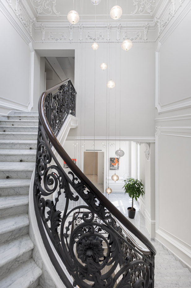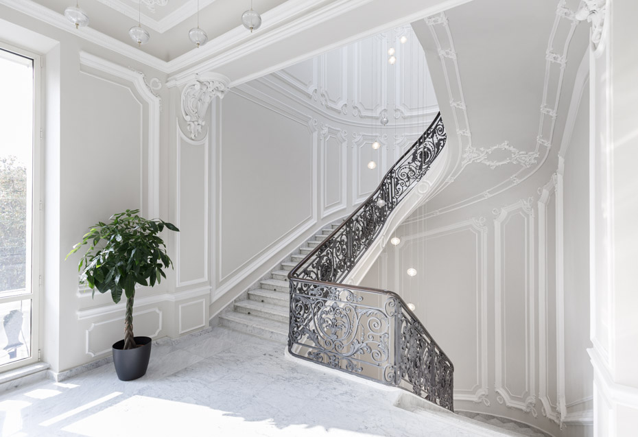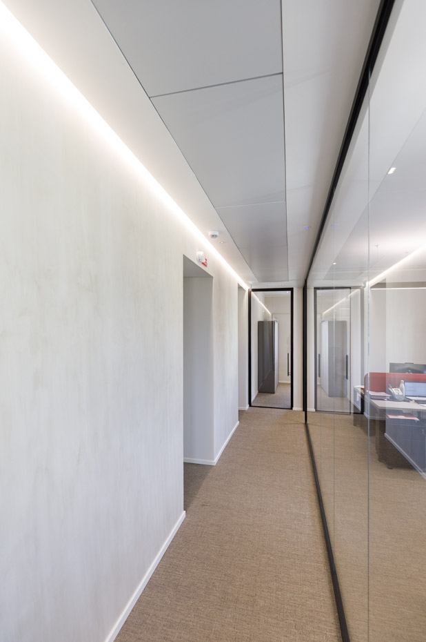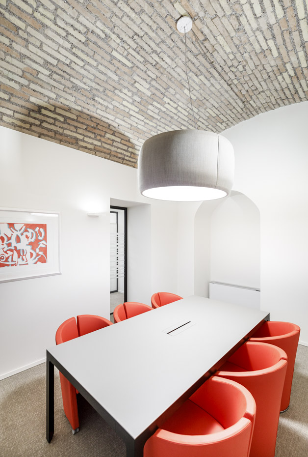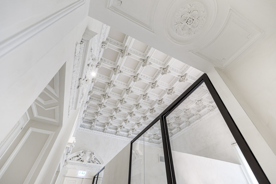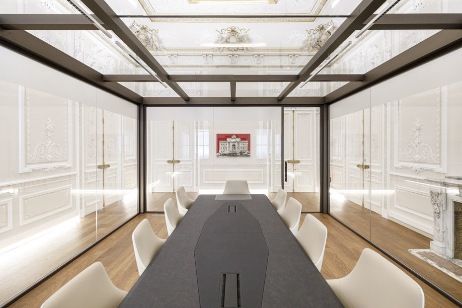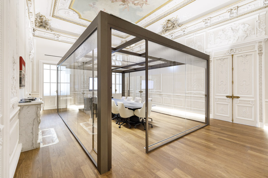 All’interno, il restauro ha riguardato gli apparati decorativi originali — stucchi e affreschi — negli ambienti di rappresentanza. Le nuove partizioni leggere in cartongesso e vetro garantiscono comfort e flessibilità. Di particolare rilievo la sala riunioni “box in the box”, in acciaio e vetro, simbolo del dialogo tra antico e contemporaneo.