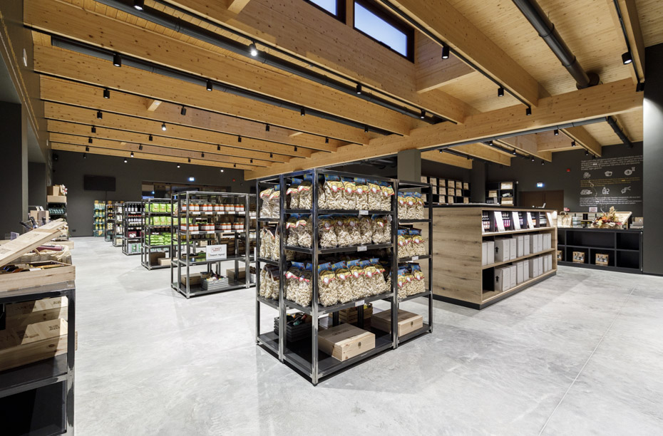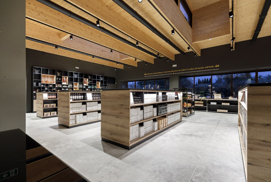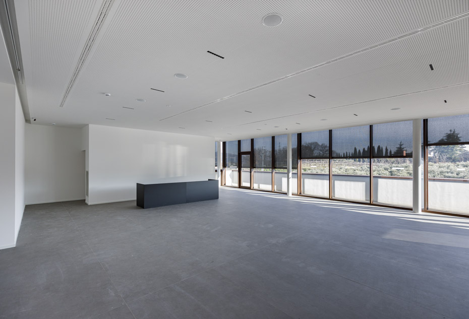 “Il nuovo volume è un diaframma architettonico che maschera i preesistenti edifici” – afferma l’architetto Alberto Pontiroli, progettista dell’opera – “e che si inserisce senza traumi cromatici nella scenografia naturale. Il prospetto est è caratterizzato da un muro in pietra di 50 metri che sostiene un’articolata geometria orizzontale di portali, vetrine, tettoie e volumi in acciaio. Ai volumi ‘pieni’ del piano terra si contrappongono quelli trasparenti del piano primo, permettendo all’auditorium di aprirsi al paesaggio. Il peso e la naturalezza della pietra si uniscono alla trasparenza del vetro e alla tecnica dell’acciaio a formare un dinamico diaframma tra volumi produttivi e paesaggio”.