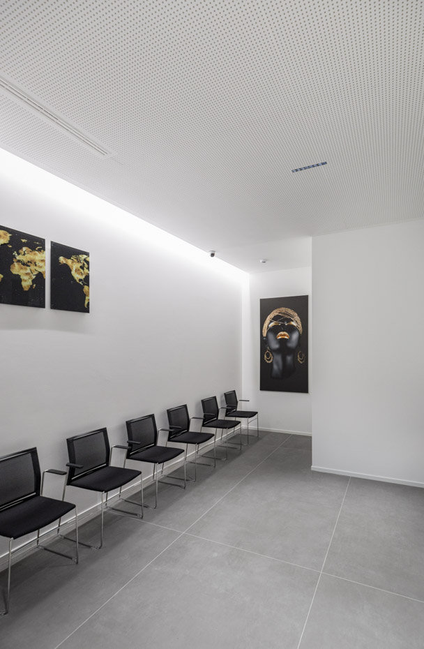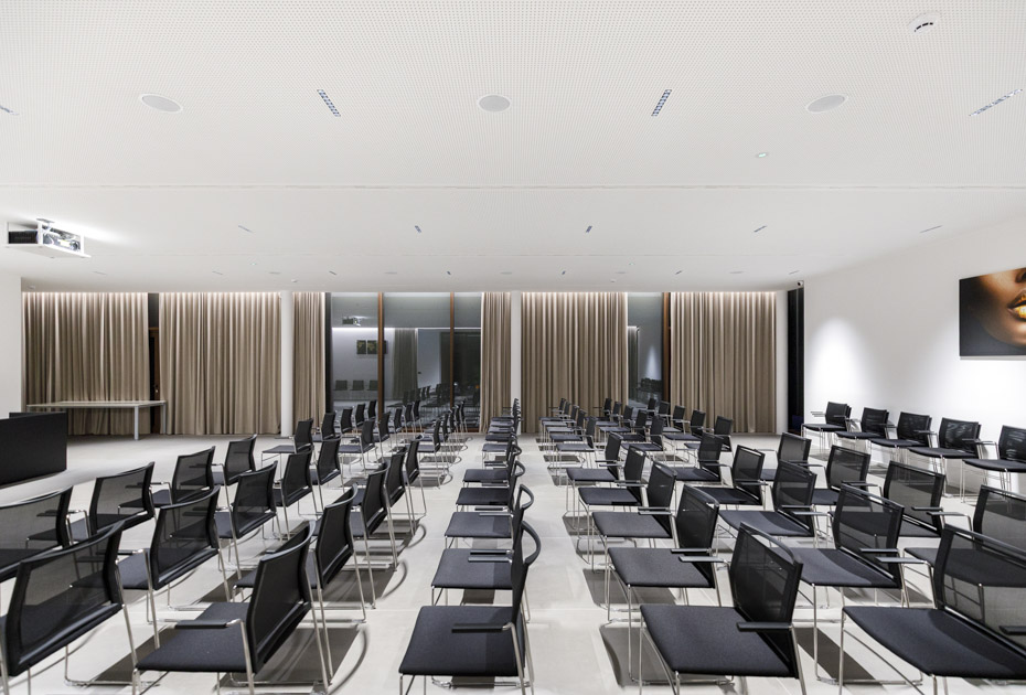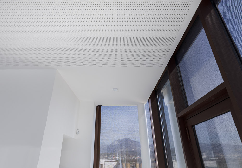 Per i controsoffitti acustici dell’auditorium, situato al primo piano, è stato scelto il sistema Gyproc Rigitone Edge 8/18 Activ’Air®, che sfrutta le caratteristiche di eleganti lastre a foratura regolare rotonda per garantire elevati livelli di prestazioni acustiche.