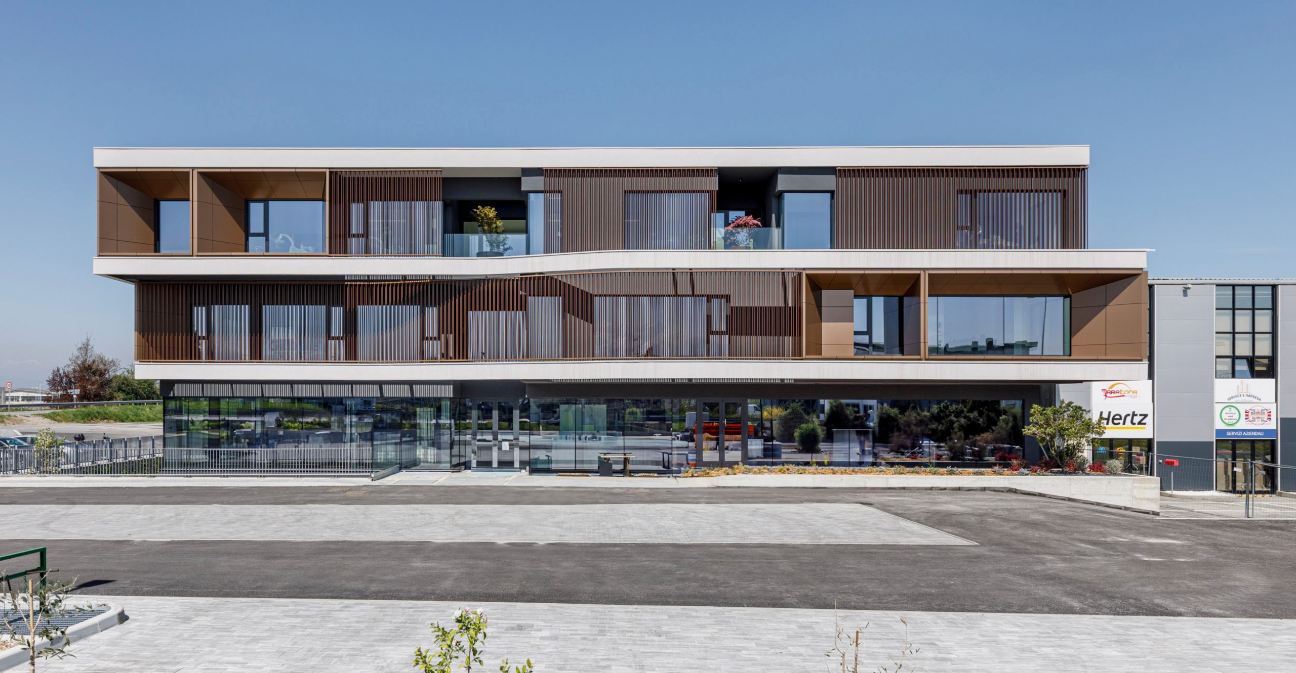 Caratterizzato da ampie superfici vetrate, l’edificio si distingue per i serramenti incorniciati da spettacolari imbotti color bronzo, che generano un forte impatto prospettico verso l’esterno e accentuano il contrasto tra luci e ombre. I prospetti sono scanditi da fasce marcapiano che sporgono dalla facciata con profondità variabili, talvolta seguendo un andamento sinuoso in netto contrasto con il volume rigido retrostante. A completamento delle facciate, alcuni tubolari metallici sfalsati, disposti lungo le fasce marcapiano, creano suggestivi intrecci visivi ed effetti di chiaroscuro proiettati verso gli ambienti interni.