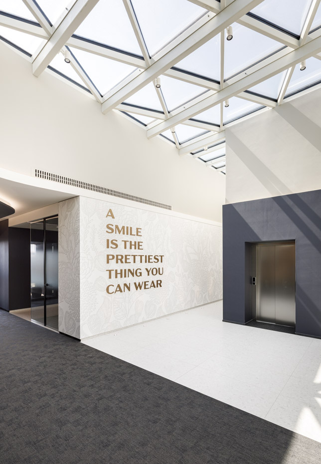 Lo studio dentistico, situato al secondo piano dell’edificio, ospita 14 “riuniti” distribuiti lungo tutto il perimetro. Ogni sala è dotata di una grande vetrata panoramica incorniciata da elementi metallici, che creano un effetto “cannocchiale” sul paesaggio circostante. La hall d’ingresso e gli spazi di accoglienza sono inondati di luce naturale, anche grazie alla presenza di un imponente lucernario posto sulla copertura.