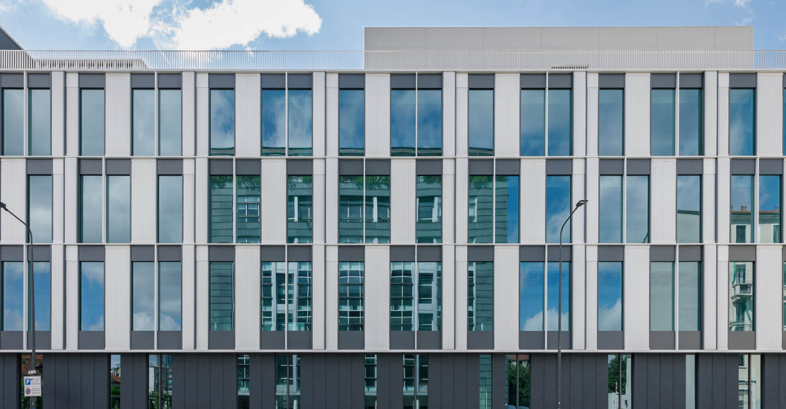 Il nuovo trattamento delle facciate conferisce all’edificio un aspetto fortemente dinamico, luminoso e ricco di contrasti, con una marcata identità estetica. Le facciate continue principali alternano vetrate selettive ad alte prestazioni Saint-Gobain Glass a porzioni opache in lamiera grecata, sottolineate da elementi marcapiano che “corrono” lungo tutto il perimetro dell’edificio.