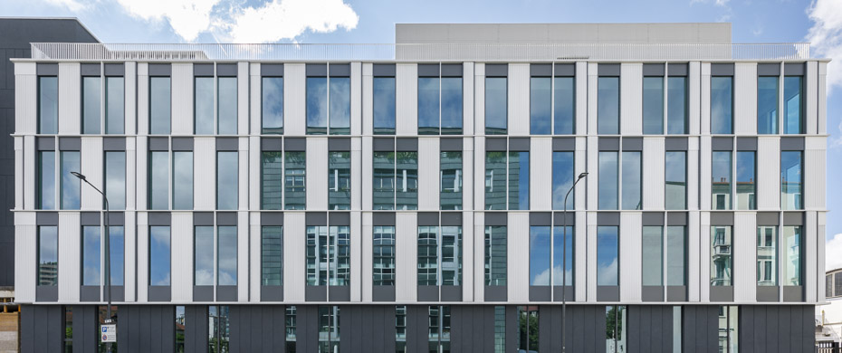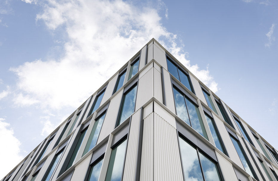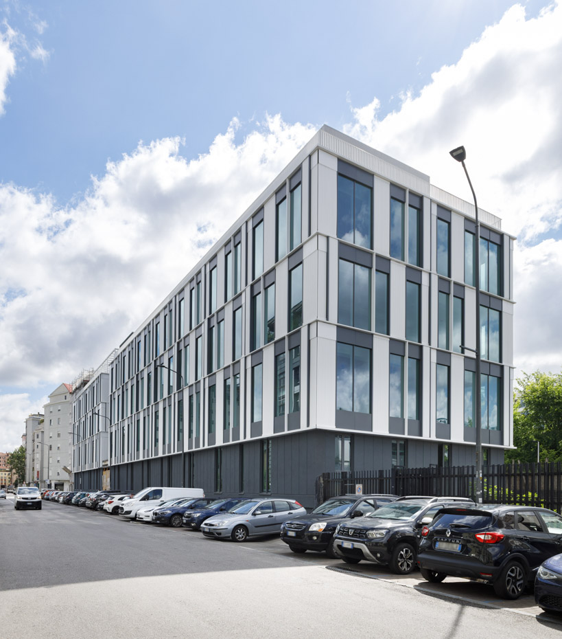Il nuovo trattamento delle facciate conferisce all’edificio un aspetto fortemente dinamico, luminoso e ricco di contrasti, con una marcata identità estetica. Le facciate continue principali alternano vetrate selettive ad alte prestazioni Saint-Gobain Glass a porzioni opache in lamiera grecata, sottolineate da elementi marcapiano che “corrono” lungo tutto il perimetro dell’edificio.