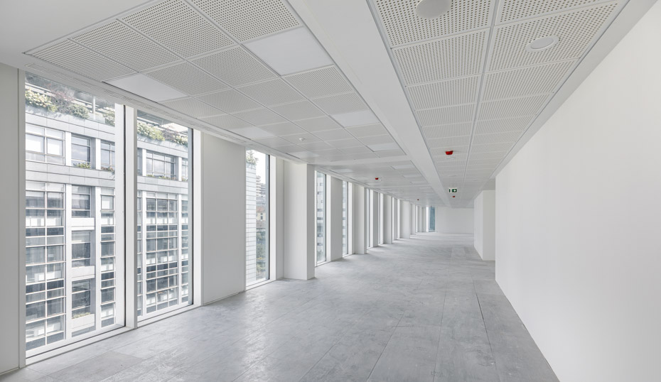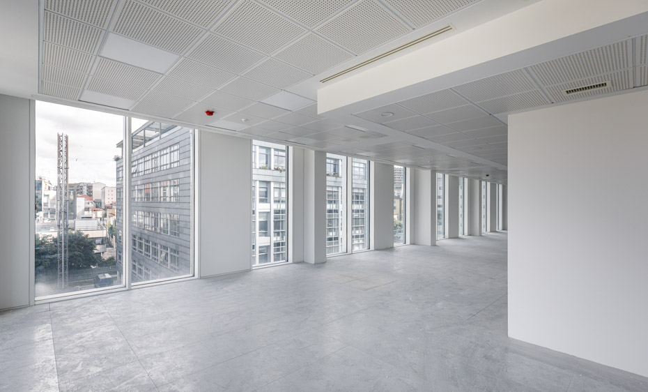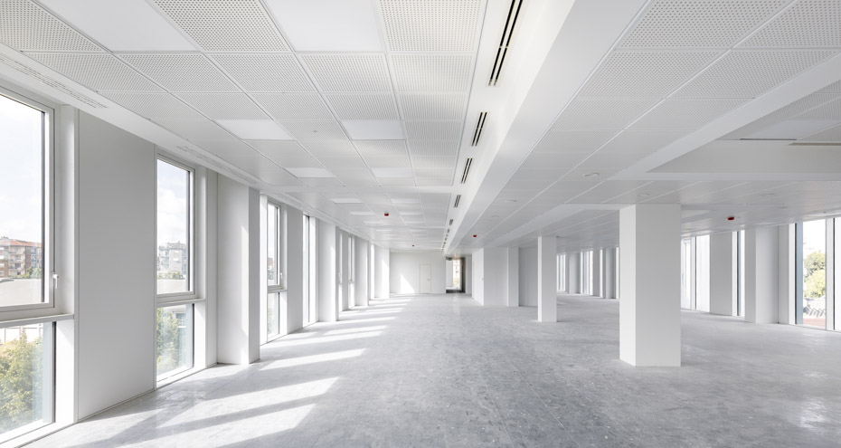 L’assetto planimetrico interno è concepito secondo una logica di massima flessibilità d’uso, consentendo l’adattamento a diverse configurazioni spaziali. La base dell’edificio ospita i servizi comuni, il piano tipo è organizzato intorno a una spina centrale – parallela ai lati lunghi – che accoglie le principali dorsali impiantistiche, mentre il piano attico, affacciato su ampie terrazze perimetrali, rappresenta lo spazio di maggior pregio del complesso.