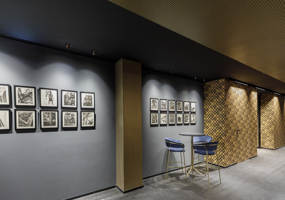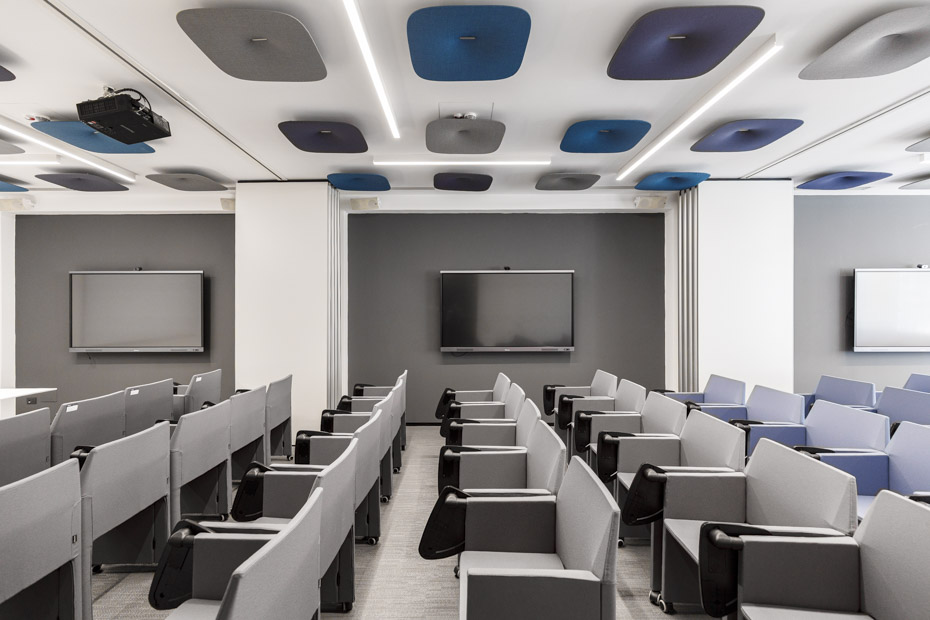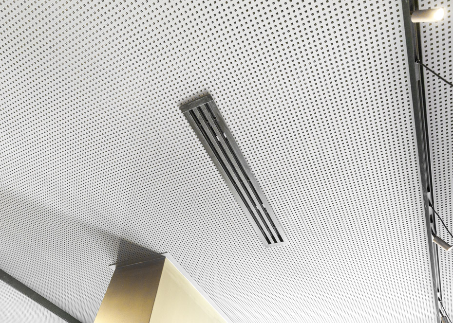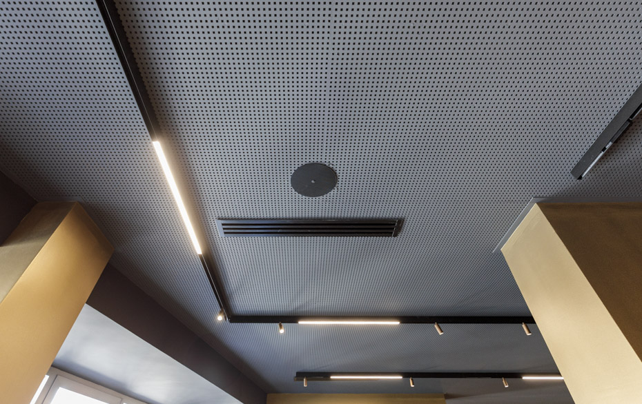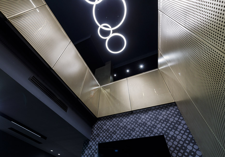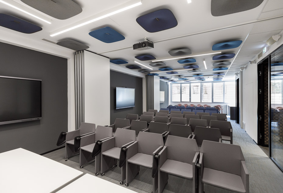 Per i controsoffitti acustici interni è stato scelto il sistema Gyproc Rigitone Edge 8/18 Q Activ’Air® , che sfrutta le caratteristiche di particolari lastre forate per garantire elevati livelli di prestazioni acustiche, mentre per i controsoffitti modulari delle sale si è optato per il sistema Eurocoustic Tonga A 22, costituito da pannelli rigidi autoportanti in lana di roccia, di colore nero, resistenti agli urti e con un piacevole impatto visivo.