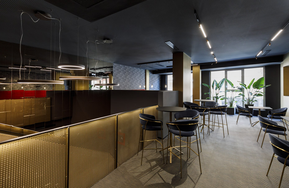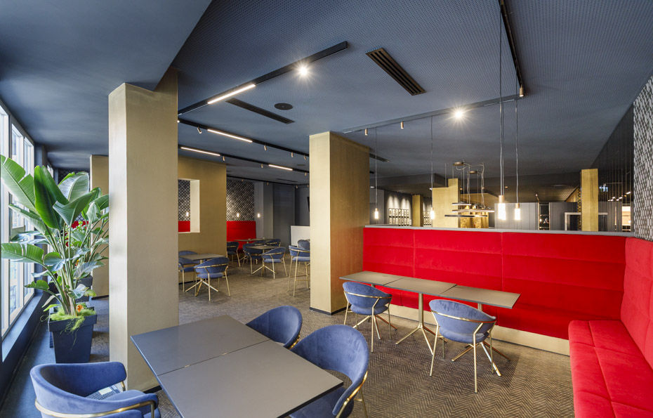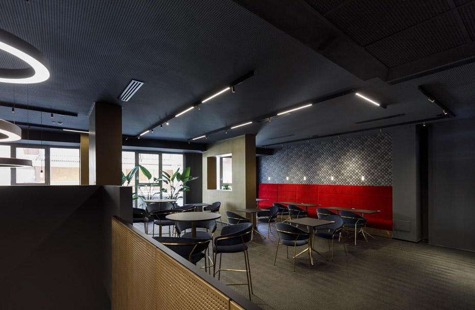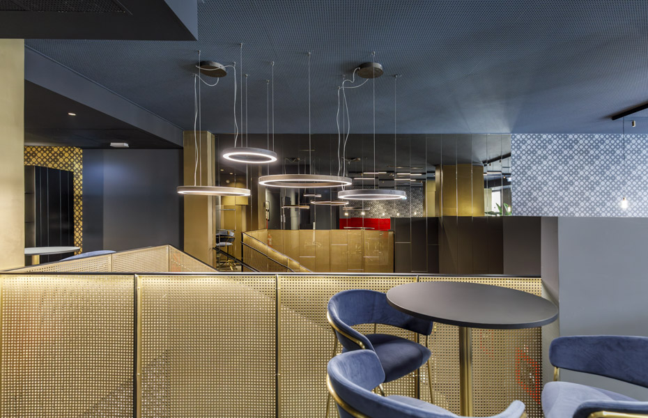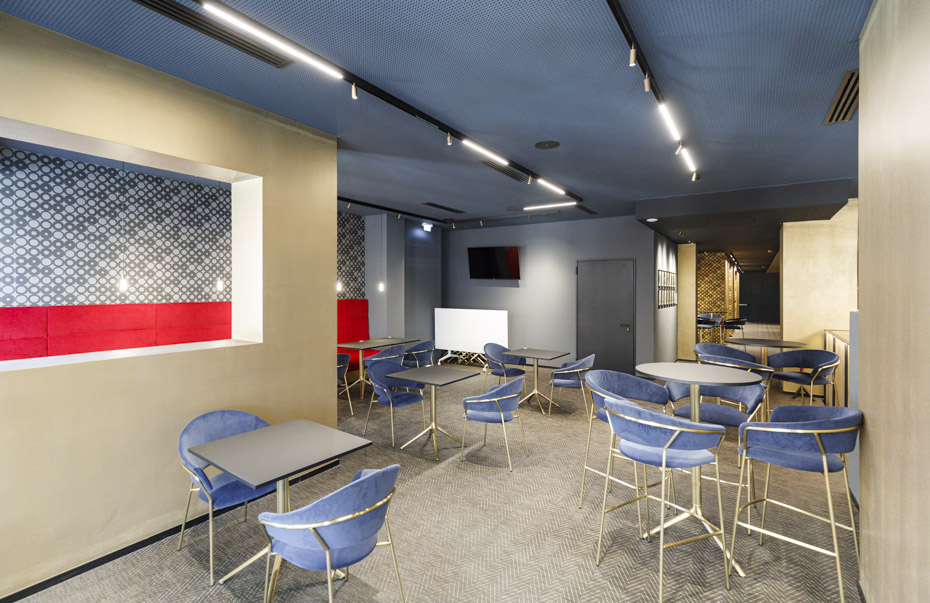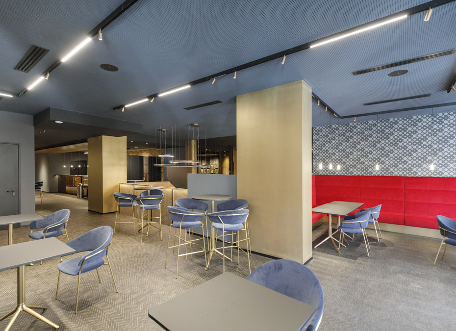 Per i controsoffitti acustici interni è stato scelto il sistema Gyproc Rigitone Edge 8/18 Q Activ’Air® , che sfrutta le caratteristiche di particolari lastre forate per garantire elevati livelli di prestazioni acustiche, mentre per i controsoffitti modulari delle sale si è optato per il sistema Eurocoustic Tonga A 22, costituito da pannelli rigidi autoportanti in lana di roccia, di colore nero, resistenti agli urti e con un piacevole impatto visivo.